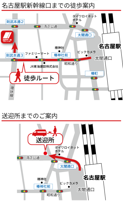- JR名古屋駅太閤口より徒歩9分。昭和通りを直進600M、環状線を右折
