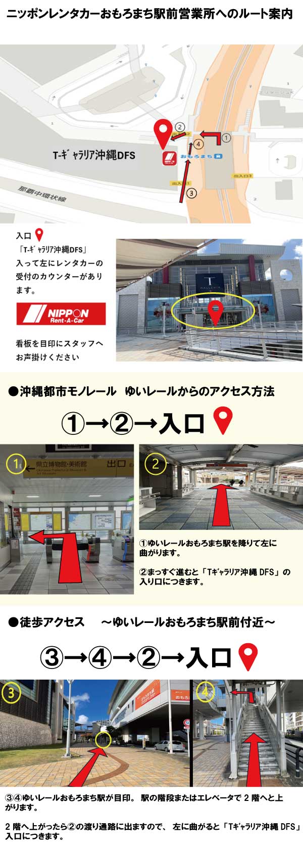 モノレール以外でご来店のお客様は「モノレールおもろまち駅」と直結している2階正面入口からDFS沖縄那覇店(旧Tギャラリア沖縄DFS)内へお入りください。
