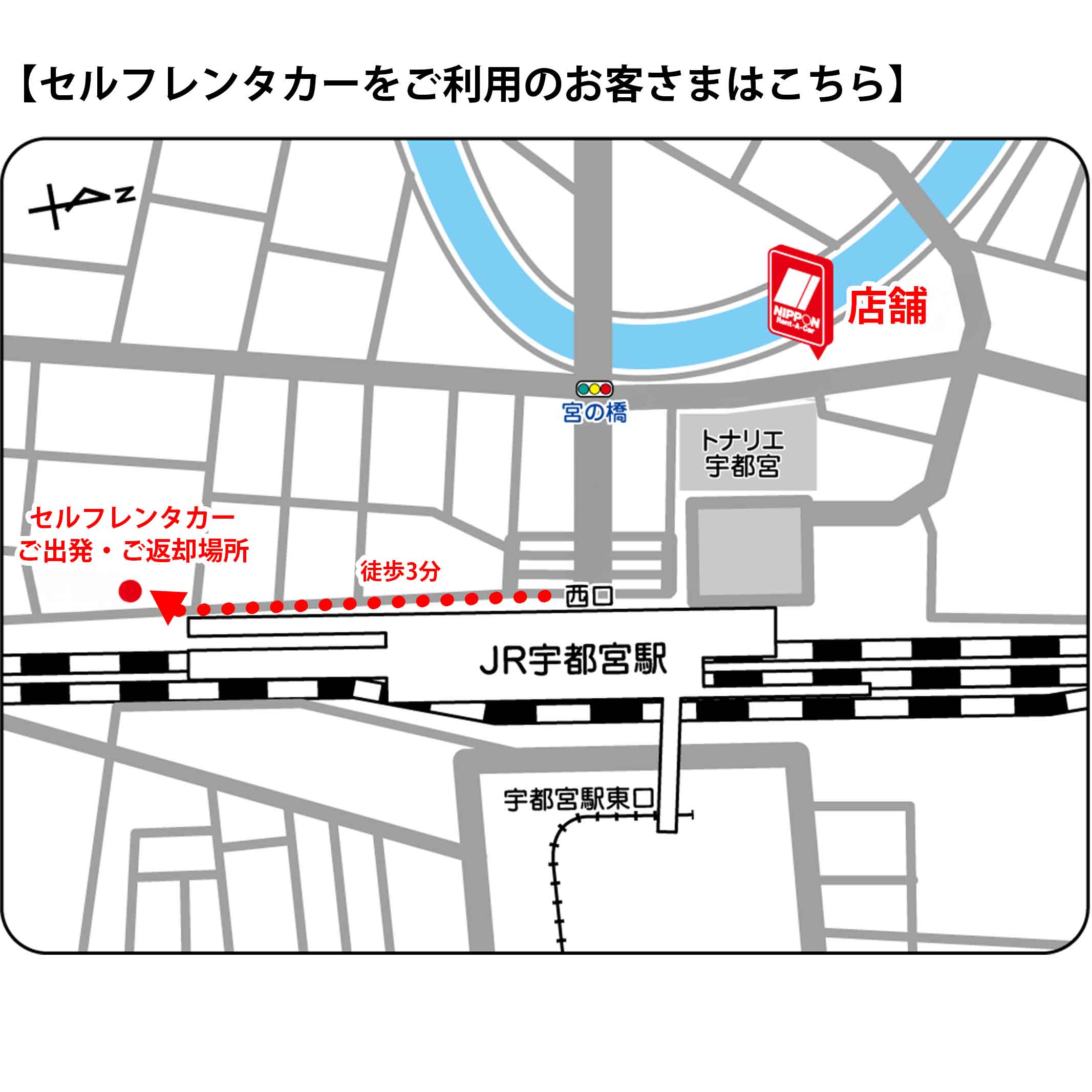 ※セルフレンタカーをご利用のお客さまは、ご出発・ご返却場所が異なりますのでご注意ください。
