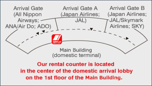 新千歳空港をご利用のお客様は、到着されましたら国内線ターミナルビル1F到着口3番付近のレンタカーカウンターまでお越しくださいませ。